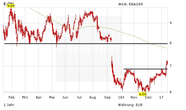 Nach der Einigung im Atomstreit könnten Übernahmegerüchte um Uniper E.on weiteren Schwung verleihen. Trotz des Rücksetzers am Freitag notiert die Aktie nach wie vor über der wichtigen Marke bei 6,90 Euro. Trader können darauf setzen, dass der DAX-Wert in einem freundlichen Marktumfeld einen neuen Angriff auf die obere Grenze der Kurslücke bei 8,00 Euro einleitet.