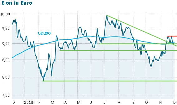 Seit Anfang November hat die E.on-Aktie bereits drei Versuche unternommen, nachhaltig über 9,00 Euro auszubrechen. Doch im Bereich zwischen 9,25 und 9,30 Euro hat sich ein Widerstand ausgebildet, den es zunächst zu überwinden gilt. Erst wenn diese Hürde übersprungen wurde, kann der Blick wieder auf die psychologisch wichtige Marke bei 10,00 Euro gerichtet werden. Seit Jahresbeginn gab es bei E.on keine zweistelligen Kurse mehr – das 2018er-Hoch liegt bei 9,95 Euro.