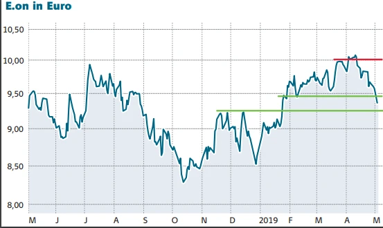 Die E.on-Aktie eröffnete den Monat Mai unterhalb der bedeutenden Unterstützungslinie bei 9,50 Euro. Diese ist mit dem gestrigen Schlusskurs von 9,41 Euro endgültig gerissen.