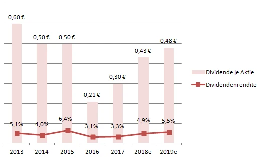 Nach der Krise wegen der milliardenschweren Atomrückstellungen musste E.on die Dividende in den Jahren bis 2016 deutlich kürzen. Doch durch die Abspaltung von Uniper und die Milliardenrückzahlung der Brennelementesteuer wurde die Bilanz deutlich gestärkt. Inzwischen ist bei der Dividende wieder ein deutlich positiver Trend zu erkennen. Für das kommende Jahr rechnen Experten bereits wieder mit einer Rendite von 5,5 Prozent.
