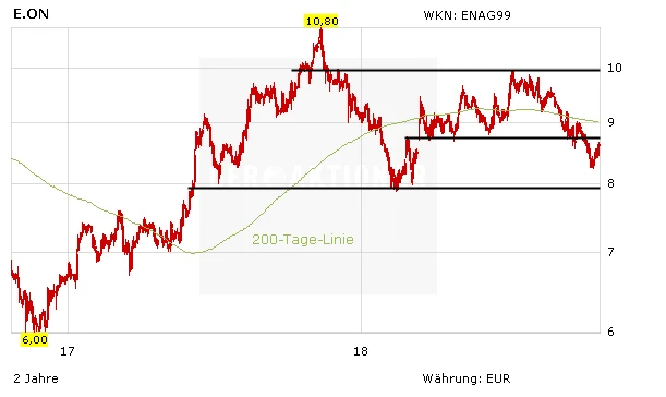 Der wichtige Widerstand bei 8,70 Euro rückt immer näher. In einem ersten Anlauf ist die E.on-Aktie im frühen Handel zwar an dieser Marke noch abgeprallt, eine neue Attacke scheint aber zeitnah möglich. Gelingt der Ausbruch, rückt zunächst die 200-Tage-Linie bei exakt 9,00 Euro in den Fokus. Im Gegensatz zu vielen anderen Werten hat diese bei E.on in den vergangenen Monaten allerdings keinen entscheidenden Einfluss gehabt, vielmehr wurde die Durchschnittslinie mehrmals sowohl nach unten als auch nach oben durchbrochen.