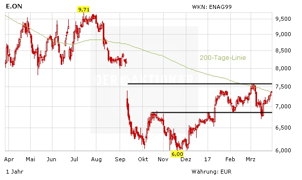 E.on benötigt Innovationen, um in der neuen Energiewelt seinen Platz zu finden. Der Vorteil: Nach der Finanzierung der Altlasten durch Kapitalerhöhung und Anleihen kann sich der Konzern nun auf die Zukunft konzentrieren. Nach wie vor halten sich auch die Übernahmespekulationen im Markt. Das Chartbild hat sich zuletzt gebessert, Anleger bleiben an Bord.