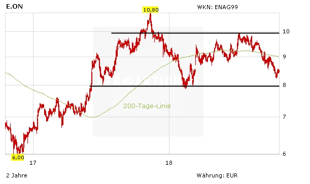 Dank der Zugewinne in der letzten Woche notiert die E.on-Aktie inzwischen wieder nahe des wichtigen Widerstands bei 8,70 Euro. Diese Marke entscheidet darüber, ob der DAX-Titel im langfristigen Seitwärtstrend einen Angriff auf die obere Begrenzung bei 10,00 Euro oder die unter Begrenzung bei 7,90 Euro starten wird. Der Sprung über 8,70 Euro wäre somit ein neues Kaufsignal und würde Tradern ein Potenzial von rund 15 Prozent bescheren.