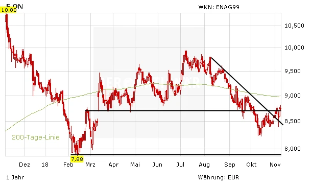 Es bleibt ein harter Kampf. Auch am Donnerstag notiert die E.on-Aktie weiterhin im Bereich von 8,70 Euro. Im Vorfeld der Quartalszahlen am kommenden Mittwoch, den 14. November, fehlen weiter die nötigen Impulse, um einen klaren Trend vorzugeben. Doch die Bewertung ist attraktiv und lässt noch Luft nach oben.