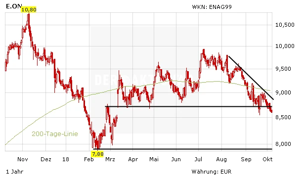 Es gibt gute Argumente für einen Einstieg bei E.on. Anleger sollten vor dem Kauf aber ein Chartsignal abwarten. Die Aktie ist zuletzt unter die wichtige Marke von 8,70 Euro gefallen. Jetzt droht im schwachen Marktumfeld ein Test der Unterstützung bei 7,90 Euro. Aktuell ist die Aktie lediglich eine Halteposition. Der Stopp für investierte Anleger liegt knapp unter der Unterstützung bei 7,80 Euro.