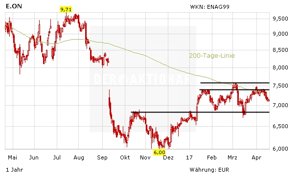Es bleibt dabei: Die E.on-Aktie hängt seit Januar im Seitwärtstrend fest. Im schwächeren Marktumfeld ist die jüngste Attacke auf den oberen Begrenzungsbereich zwischen 7,40 und 7,60 Euro erneut gescheitert. Die Unterstützung bei 6,80 Euro rückt wieder näher. Auch operativ gab es zuletzt einen Rückschlag.