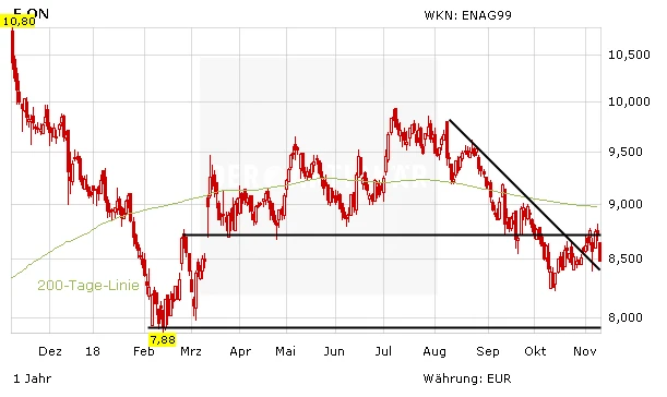 Die Berg- und Talfahrt bei E.on setzt sich unverändert fort. Inzwischen wurde der nächste Ausbruchsversuch aus dem Seitwärtstrend abverkauft. Es verfestigt sich der Eindruck, dass die Aktie vor den Zahlen am 14. November weiter um 8,70 Euro pendelt. Die Analysten bleiben allerdings zuversichtlich.
