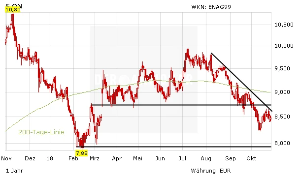 DER AKTIONÄR hat in den vergangenen Wochen mehrfach darauf hingewiesen. E.on schlägt sich im schwachen Marktumfeld zwar wacker, es fehlt aber nach wie vor ein neues Kaufsignal. Die Aktie ist aktuell eine Halteposition mit Stopp bei 7,90 Euro. Langfristig bleibt der Versorger für Konservative interessant.