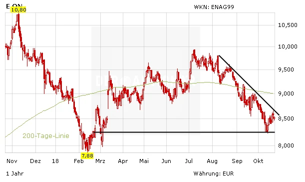Mit Spannung werden vor allem die Zahlen für das dritte Quartal erwartet, die am 14. November präsentiert werden. Interessant wird es aber bereits einen Tag vorher, denn schon am 13. November wird die künftige Tochter Innogy Einblick in die Bücher gewähren. Fallen die Ergebnisse jeweils positiv aus, könnte spätestens dann der Startschuss für den Ausbruch aus dem Seitwärtstrend erfolgen und die neue Attacke auf den Widerstand bei 10,00 Euro erfolgen.