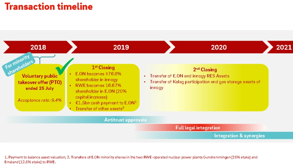 2019 geht es vor allem darum, die Bedenken der Kartellbehörden auszuräumen. E.on rechnet damit, dass dann bereits in diesem Jahr das erste Closing erfolgt und die Integrationsprozesse beginnen. Dabei sollen die Beteiligungen an Innogy und den Atomkraftwerken Gundremmingen und Emsland mit RWE getauscht werden, die Cashzahlungen erfolgen und RWE wird sich bei E.on beteiligen.