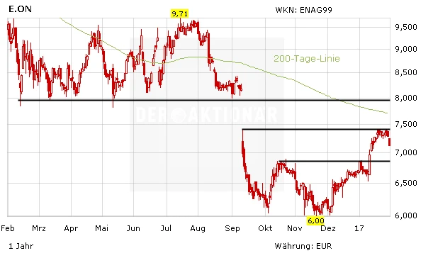In den vergangenen Tagen hatte die E.on-Aktie mehrfach versucht, den Widerstand bei 7,30 Euro zu überwinden. Trotz einer guten Nachrichtenlage und einem starken Umfeld ist der Ausbruch aber nicht gelungen. Sollte die Aktie wieder unter die 6,90-Euro-Marke fallen, droht eine nachhaltige Fortsetzung des Seitwärtstrends.