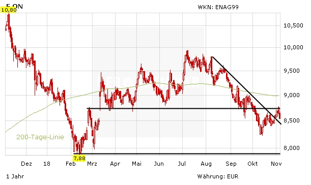 Mit einem Minus von rund zwei Prozent im frühen Handel trägt E.on vielmehr die rote Laterne im DAX. Aus charttechnischer Sicht ist das ein deutlicher Rückschlag. Bei einem nachhaltigen Ausbruch wäre lediglich die 200-Tage-Linie bei 8,98 Euro als näherer Widerstand verblieben. Doch nun müssen Anleger den Blick auch wieder auf den eigentlich bereits gebrochenen Abwärtstrend richten. Nach unten wäre dann ein erneuter Test der massiven Unterstützung bei 7,90 Euro möglich.