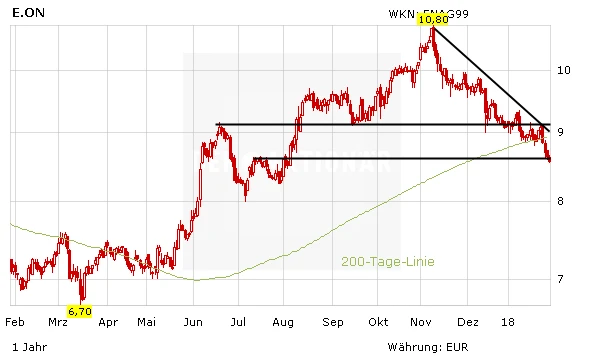Die Energiewende wird weiter vorangetrieben. E.on befindet sich hier auf dem richtigen Weg. Seit der Gewinnwarnung von Innogy im Dezember fehlen der Aktie aber kurzfristig die Impulse. Durch den Bruch der 200-Tage-Linie hat sich das Chartbild zudem weiter eingetrübt. Neueinsteiger sollten aktuell an der Seitenlinie bleiben. Wer bereits investiert ist, beachtet den Stoppkurs bei 7,80 Euro.