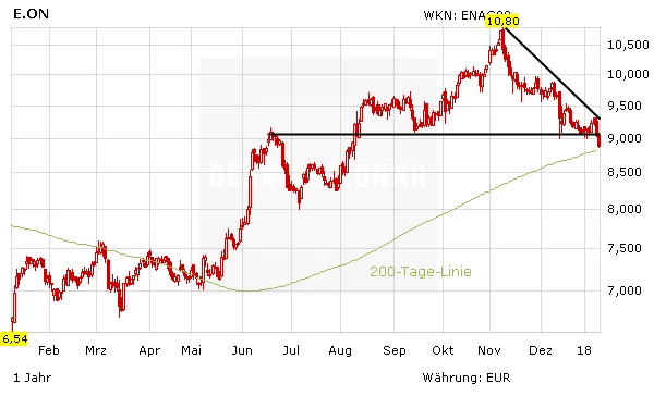 Im schwachen Marktumfeld ist die E.on-Aktie unter Druck geraten und unter die wichtige 9,00-Euro-Marke gefallen. Neueinsteiger sollten aktuell abwarten, bis es neue Impulse gibt. Wer investiert ist, bleibt an Bord und beachtet den Stoppkurs bei 7,80 Euro.