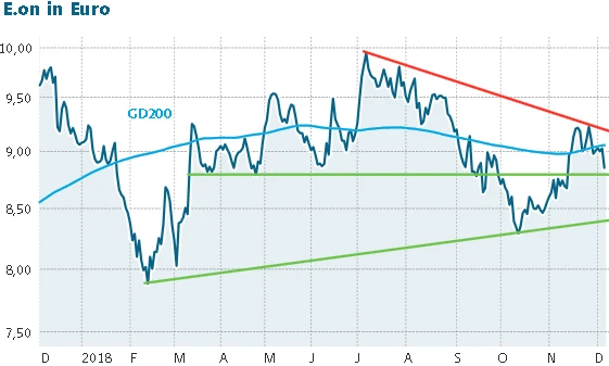 Der Gesamtmarkt taumelt weiterhin. Die E.on-Aktie hält sich dagegen bislang noch relativ gut. Nachdem die 9,00-Euro-Marke nun allerdings nach unten durchbrochen wurde, dürfte es zunächst einmal zum Test der Unterstützung bei 8,70 Euro kommen. Anleger fallen nicht in Panik, bleiben dabei und setzen den Stopp unverändert bei 7,80 Euro.