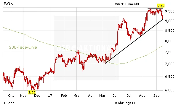Die Aussichten für E.on bleiben gut. Mit dem Ausbruch über 9,70 Euro würde ein neues Kaufsignal generiert. Anleger lassen die Gewinne laufen und setzen auf weitere Kursgewinne. DER AKTIONÄR spekuliert im Hebel-Depot nach wie vor gehebelt auf steigende Kurse.