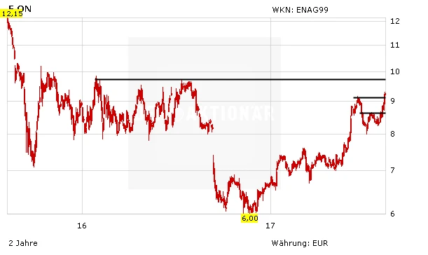 Von den 30 weiteren Experten, die sich regelmäßig mit der E.on-Aktie befassen, empfehlen 18 ebenfalls den Kauf der DAX-Titel. Sieben Analysten stufen die Aktie mit Halten ein, nur fünf raten zum Verkauf. Das durchschnittliche Kursziel liegt mit 9,43 Euro zwar nur noch knapp über dem aktuellen Kursniveau, die Tendenz ist aber klar steigend.