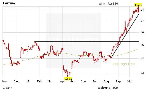 Konservative Anleger können sich auch Fortum-Aktien ins Depot legen. Die Finnen glänzen mit starkem Chart, toller Geschäftsentwicklung und starker Finanzposition. Seit der Empfehlung des AKTIONÄR im Juli liegt die Aktie bereits 30 Prozent vorn. Uniper dagegen ist aktuell kein Kauf. Hier droht wegen des Übernahmeangebots vorerst eine Seitwärtsbewegung.