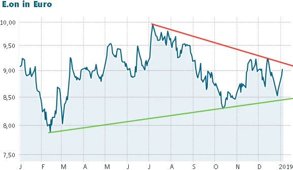 Im anhaltend schwierigen Marktumfeld präsentiert sich die E.on-Aktie zum Jahresstart 2019 sehr stark. Gemeinsam mit dem Wettbewerber RWE führt der Versorger den DAX an. Inzwischen wurde sogar die 9,00-Euro-Marke zurückerobert. Im neuen Jahr wird es vor allem darauf ankommen, wie es mit der Übernahme der RWE-Tochter Innogy vorangeht.