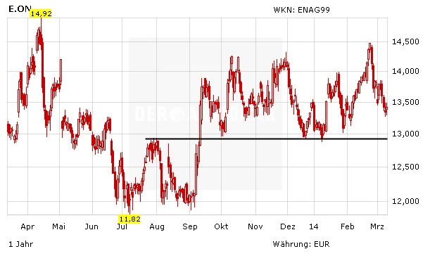 Der Umsatz fiel um 7 Prozent auf 122,5 Milliarden Euro, das um Sondereffekte bereinigte operative Ergebnis (Ebitda) lag mit 9,3 Milliarden Euro 14 Prozent unter dem Vorjahreswert. Das Ergebnis unter dem Strich (inklusive Bewertungseffekte) reduzierte sich um 2 Prozent auf 2,1 Milliarden Euro. Mit den Zahlen lag E.on teilweise ein Stück über den Erwartungen der Analysten. Seine eigenen, im November nach unten angepassten Ziele erreichte E.on: Der Konzern war für 2013 von einem operativen Ergebnis von 9,2 bis 9,3 Milliarden Euro und einem bereinigten Konzernüberschuss von 2,2 bis 2,4 Milliarden Euro ausgegangen. Als Dividende will das Unternehmen 0,60 Euro je Aktie zahlen, nach 1,10 Euro im Vorjahr.