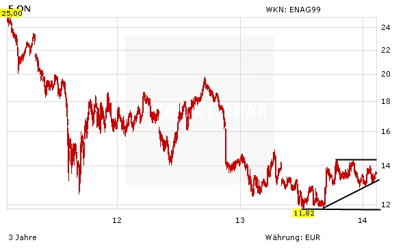 E.on hat in der Tat zahlreiche Probleme. Diese sollten aber angesichts einer Börsenbewertung des stets profitablen Unternehmens knapp 30 Prozent unter dem Buchwert mehr als eingepreist sein. Zudem lockt das Papier mit einer stattlichen Dividendenrendite von 4,5 Prozent. Das Kursziel lautet nach wie vor 17,00 Euro, der Stopp sollte bei 11,50 Euro belassen werden.