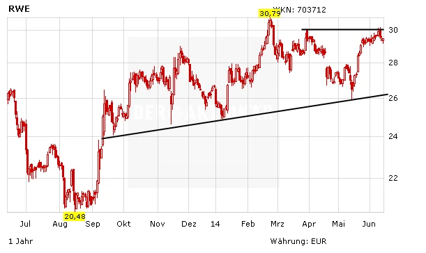 Obwohl die RWE-Aktie nach wie vor im Bereich der 30-Euro-Marke notiert, ist ein nachhaltiger Ausbruch über das Jahreshoch bei 30,73 Euro unwahrscheinlich. Sollte der Kurs nach unten drehen, wartet eine wichtige Unterstützung bei 26,00 Euro.
