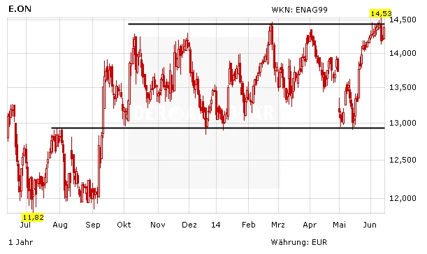 Der E.on-Chart ist für Anleger nach wie vor zum Verzweifeln. Der massive Widerstand bei 14,50 Euro kann nach wie vor nicht überwunden werden. Der langfristige Seitwärtstrend setzt sich fort. Neues Potenzial würde erst durch einen Ausbruch über diese Marke freigesetzt.