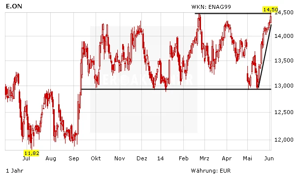 Charttechnisch betrachtet könnte sich das Bild bei E.on weiter aufhellen. Die Aktien befinden sich seit Mitte September in einer Seitwärtsrange zwischen 13,00 Euro und 14,48 Euro. Gelingt dem Wert nun der Ausbruch, wäre der Weg bis in den Bereich von 15,50 Euro frei.