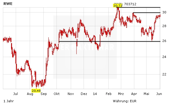 Die RWE-Aktie kämpft momentan mit der 30-Euro-Marke. Kann dieser Bereich überwunden werden, ist das nächste Etappenziel das Jahreshoch bei 30,73 Euro. Eine wichtige Unterstützung findet sich bei 26,00 Euro.