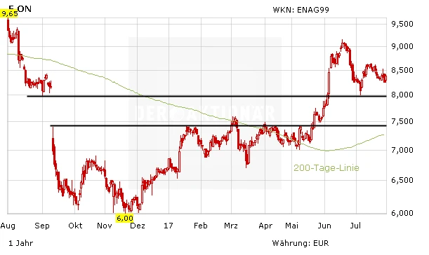 Optimistisch ist auch die US-Bank JPMorgan. Die Einstufung lautet unverändert „Overweight“ mit Kursziel 9,50 Euro. E.on dürfte laut der Studie im zweiten Quartal deutlich besser abgeschnitten haben als im ersten. Am Mittwoch in einer Woche, dem 09. August, wird E.on die Zahlen zum zweiten Quartal präsentieren. Eine Woche später, am 14. August, wird der Wettbewerber RWE ebenfalls Einblick in seine Bücher gewähren.