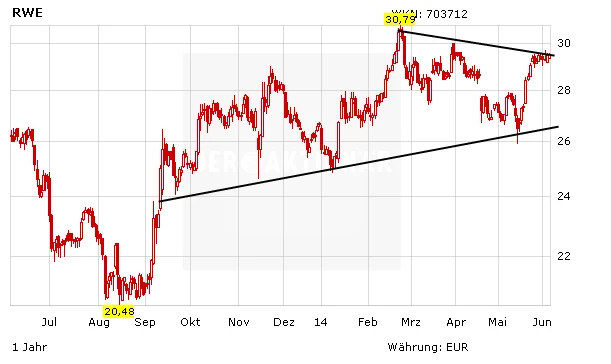 Obwohl die RWE-Aktie zuletzt erneut die 30-Euro-Marke testete, erscheint ein nachhaltiger Ausbruch über das Jahreshoch bei 30,73 Euro derzeit eher unwahrscheinlich. Sollte der Kurs einmal mehr nach unten drehen, wartet eine wichtige Unterstützung bei 26,00 Euro.