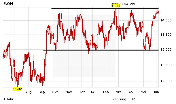Der E.on-Chart ist für Anleger zum Verzweifeln. Wie so oft ist die Aktie nach einem starken Kursanstieg an der unüberwindbar scheinenden Hürde bei 14,50 Euro abgeprallt. Der langfristige Seitwärtstrend setzt sich somit fort. Neues Potenzial würde erst durch einen Ausbruch über diese Marke freigesetzt.