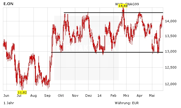 Charttechnisch betrachtet bleibt die E.on-Aktie in ihrer seit Mitte September bestehenden Seitwärtsrange zwischen 13,00 Euor und 14,40 Euro. Würde dem Wert der Ausbruch nach oben gelingen, wäre der Weg bis in den Bereich von 15,50 Euro frei.