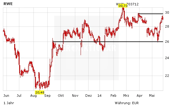 Die charttechnische Situation hat sich bei RWE zuletzt deutlich verbessert. Der Wert notiert derzeit vor dem Widerstand bei 29,00 Euro und könnte durchaus in den kommenden Tagen einen Angriff auf das bisherige 52-Wochen-Hoch bei 30,73 Euro starten. Die nächste Unterstützung findet sich im Bereich der 26-Euro-Marke.