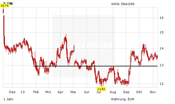 Noch skeptischer sind die Erwartungen für das Ergebnis. Pro Aktie erwarten die Analysten hier im Schnitt ein bereinigtes Plus von 0,26 Euro. Das wäre ein Rückgang um 31 Prozent im Vergleich zum Vorjahreszeitraum. Immerhin konnte E.on bei fünf der letzten sieben Quartalszahlen die Ergebniserwartungen schlagen. Die Analysten sind ohnehin sehr zurückhaltend gestimmt. Nur neun von 36 Experten empfehlen die Aktie zum Kauf, 13 dagegen stufen sie auf Verkaufen ein. Das durchschnittliche Kursziel der Analysten liegt mit 12,63 Euro ein gutes Stück unter dem aktuellen Kurs.