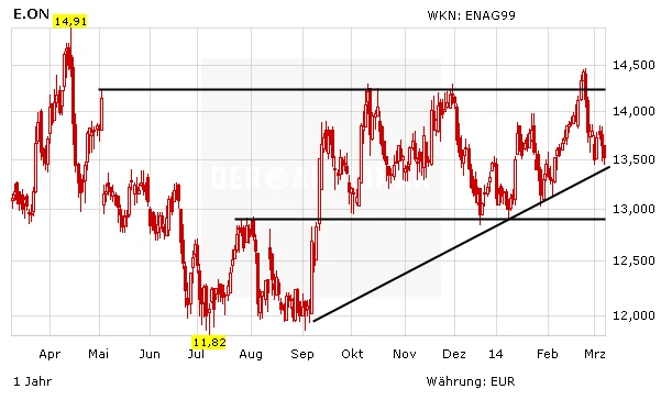 Nach dem Kursanstieg ist es bei E.on zuletzt wieder abwärts gegangen. Die Probleme, die der Konzern hat, sollten auf dem aktuellen Niveau eingepreist sein. Das profitable Unternehmen lockt zudem mit einer Dividendenrendite von 4,5 Prozent. Mit Spannung werden nun die Geschäftszahlen erwartet. Investierte Anleger sichern die Position weiterhin mit dem Stopp bei 11,50 Euro ab. Neueinsteiger warten die Zahlen ab.
