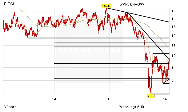 Derzeit spekuliert David Einhorn auf ein Abwälzen der Atom-Kosten auf die Menschen in Deutschland. Andere hoffen auf eine hohe Dividendenrendite. Zudem ist noch ein Kaufsignal des Trendindikator MACD gültig. Dennoch prallte die Notierung an der beim Hoch von April 2015 begonnenen Abwärtstrendlinie bei 9,65 Euro ab. Derzeit notiert die Aktie beim Hoch von Mai 1994 von rund 9,40 Euro. Nach dieser Abwärtstrendlinie warten noch viele Widerstandslinien: das Hoch von Juli 1995 bei 9,95 Euro, das Hoch von Oktober 2015 bei 10,25 Euro, die sinkende 200-Tage-Linie bei 10,65 Euro, das Tief von März 2003 bei 11,35 Euro, die seit dem Hoch von Dezember 2014 gültige Abwärtstrendlinie bei 13,60 Euro, das Tief von Juli 2013 bei 14,65 Euro und die Hochs von April 2015 und Dezember 2014 bei 14,85 und 15,50 Euro.