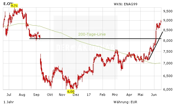 Die E.on-Aktie setzt ihren Höhenflug der vergangenen Wochen fort. Im freundlichen Marktumfeld sind die Papiere des Versorgers zwischenzeitlich sogar über die 9,00-Euro-Marke geklettert. Positive Analystenstudien verleihen neuen Schwung. RWE steht dagegen nach einer Abstufung am DAX-Ende.