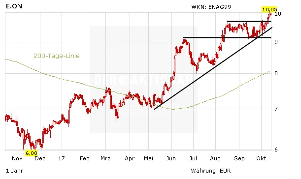 Es läuft rund bei E.on. Die bilanzielle Situation entspannt sich und der Konzern ist gut gerüstet für die Herausforderungen in der neuen Energiewelt. Erneuerbare Energien, Elektromobilität und Smart Home sorgen für neue Wachstumsfantasie. Das Chartbild sieht ebenfalls glänzend aus, der nachhaltige Ausbruch über die 10-Euro-Marke steht bevor. DER AKTIONÄR bleibt optimistisch und spekuliert im Hebel-Depot mit Hebel auf weiter steigende Kurse.