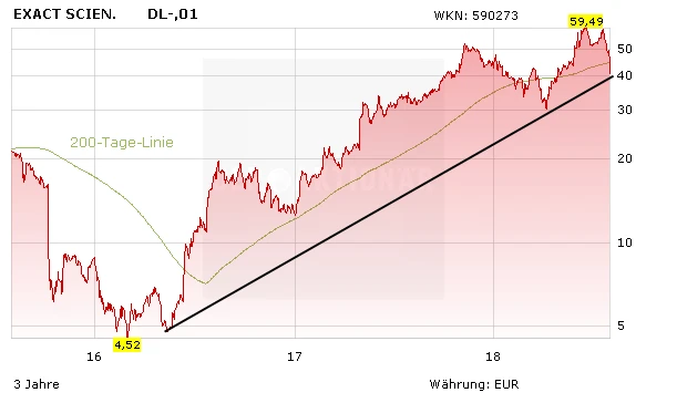 Ohne Frage, Exact Sciences hat eine enorm hohe Bewertung von rund 5,5 Milliarden Dollar (inklusive des nachbörslichen Kursverlustes). Die Wachstumsstory ist intakt, mit dem Rücksetzer sind allerdings wichtige Unterstützungen gefallen. Nur hochspekulative Anleger sollten die Eröffnung der US-Börsen abwarten und beim Kompensieren des Kursverlustes eine spekulative Trading-Position eingehen. Ansonsten gilt: Watchlist.