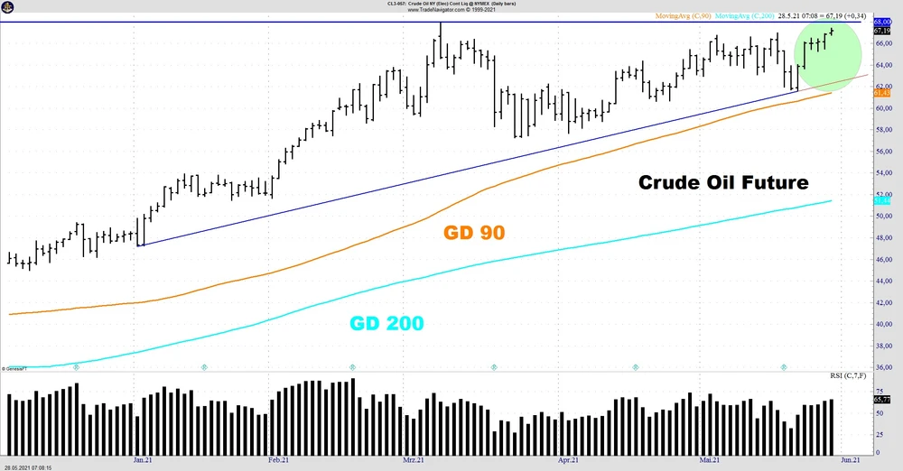 Der Crude Öl Future hat am Freitag bei 67,52 Dollar den höchsten Stand seit dem Jahres-Hoch am 8. März erreicht und das obwohl sich in den Aktienmärkten kein eindeutiger Trend bemerkbar gemacht hat. Nun sind die Augen auf das OPEC+ Treffen am kommenden Dienstag gerichtet.