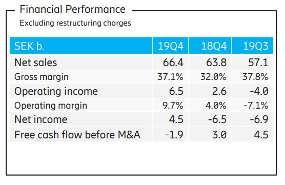 Der Nettogewinn konnte im vierten Quartal auf 4,5 Milliarden SEK gesteigert werden, im gesamten Jahr waren es 1,8 Milliarden SEK. Der Jahresumsatz stieg um vier Prozent und der des letzten Quartals um ein Prozent. Die Bruttomarge des Netzwerksektors verringerte sich, aufgrund der Übernahme des Antennenherstellers Kathrein. Diese Entwicklung wird allerdings durch die anderen Sektoren kompensiert und insgesamt bleibt die Bruttomarge konstant.