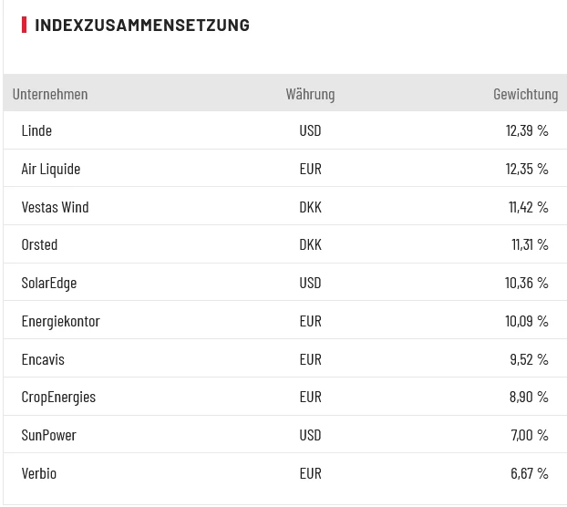 Der Index besteht aktuell aus zehn Unternehmen aus den Sektoren Wasserstoff, Windkraft, Solarenergie und Biomasse. Laut der IEA dürfte vor allem der Einsatz von Photovoltaik- und Windkraftanlagen stark zunehmen. Davon sollten insbesondere die Indexmitglieder Vestas Wind, Ørsted, SolarEdge, Encavis und SunPower profitieren.