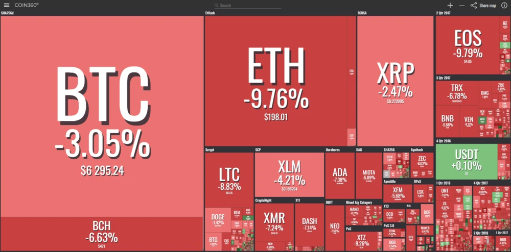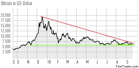Im Vergleich zu Ethereum und vielen anderen Coins schlägt sich der Bitcoin relativ wacker und verliert lediglich drei Prozent. Aus charttechnischer Sicht ist der erneute Fall in den Bereich von 6.300 Dollar aber als Rückschlag zu werten. Statt des langersehnten Ausbruchs aus dem seit Dezember 2017 gültigen Abwärtstrend rückt der Blick nun wieder auf die Unterstützung unterhalb der 6.000-Dollar-Marke. Spätestens hier sollte der Kurs einen Boden finden.