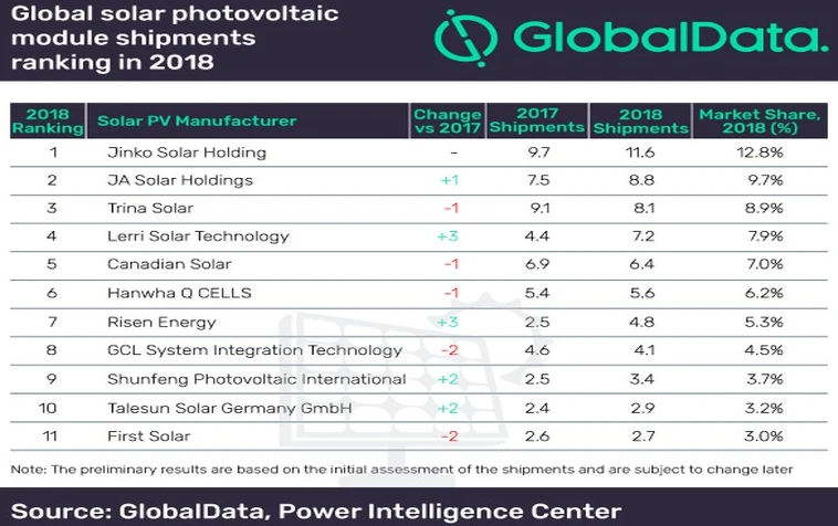 JinkoSolar bleibt beim Absatz mit Abstand in der Pole-Position. Im Aufwind befindet sich laut den Erhebungen von GlobalData Lerri Solar Technology, die sogar Canadian Solar verdrängt haben.