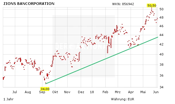 Noch hat Zions Bancorporation diesbezüglich nichts angekündigt. Doch angesichts der guten Finanzierung der Bank sieht DER AKTIONÄR hier Potenzial: Zielkurs ist 54 Euro.