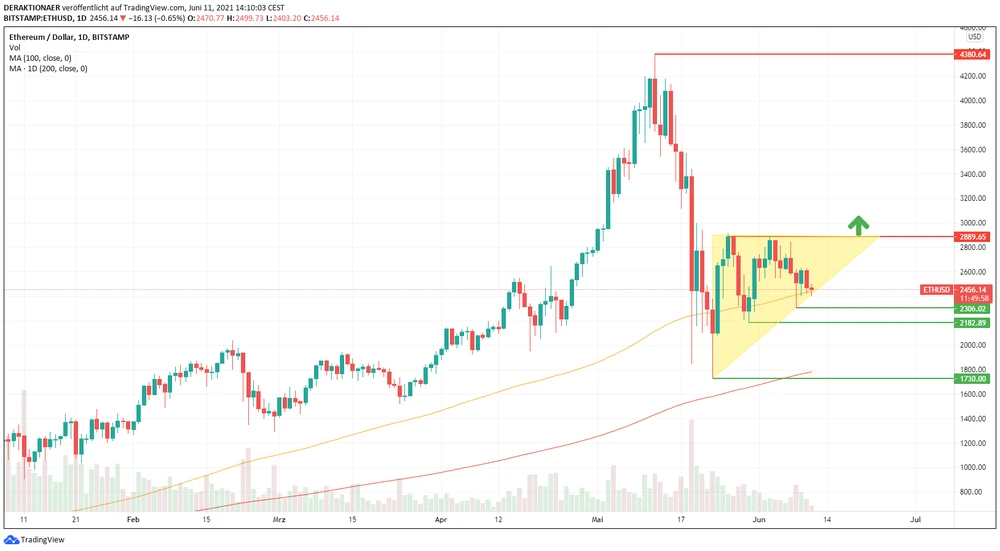 Der Mai war für Krypto-Anleger ein Monat der Extreme. Ethereum wurde nach dem Allzeithoch zwar auch hart getroffen, konnte sich aber bisher stärker erholen als viele andere Krypto-Coins. Der ETH-Kurs hat in den letzten Tagen eine bullishe Dreiecksformation gebildet. Die Chancen stehen gut für einen Long-Ausbruch. Risikofreudige Anleger können mit gestaffelten Einstiegen arbeiten und den Stopp unter den GD200 bei 1.700 Dollar platzieren.