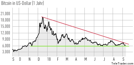 Etwas besser als Ethereum schlägt sich der Bitcoin, der derzeit mit einem Abschlag von rund eineinhalb Prozent im Bereich von 6.300 Dollar notiert. Damit hat sich das Chartbild in den letzten Tagen nicht verbessert, aber immerhin auch nicht signifikant verschlechtert. Es besteht weiterhin die Hoffnung, dass demnächst ein Ausbruch aus der charttechnischen Dreiecksformation – bestehend aus der Unterstützungslinie im Bereich von 5.900 Dollar und der Abwärtstrendlinie bei 7.400 Dollar – gelingt. Dies wäre ein Kaufsignal und könnte gemeinsam mit einem positiveren Newsflow wieder für etwas mehr Momentum sorgen.