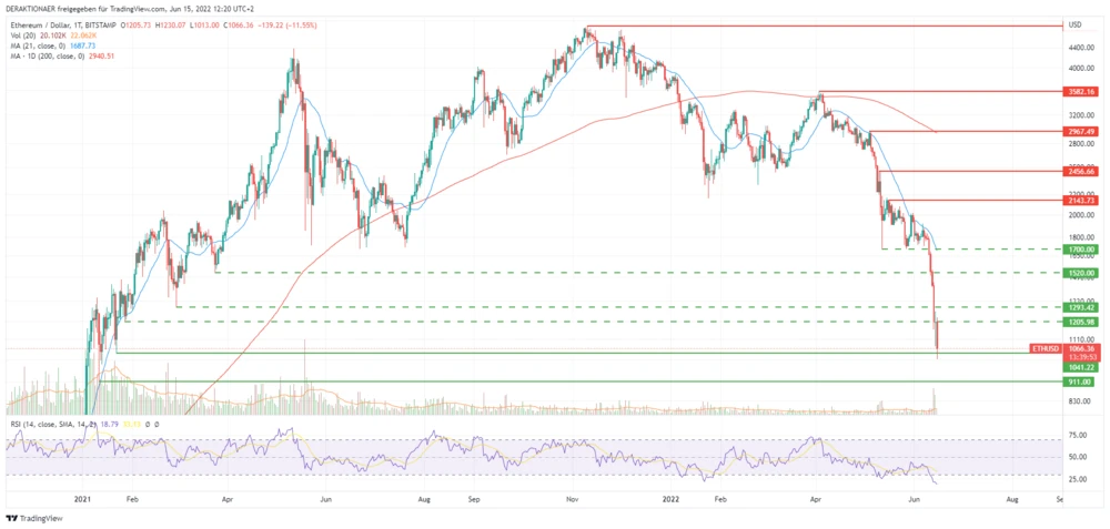 Aus technischer Sicht gab es bei Ethereum (ETH) am gestrigen Dienstag eine dynamische Gegenbewegung bis an die 1.200-Dollar-Marke zurück. Am heutigen Mittwoch ist der Kurs bereits wieder gefallen und notiert nun nahe an der psychologisch wichtige 1.000-Dollar-Marke, die als starke Unterstützung fungiert. Sollte auch dieser Support nicht halten, droht ein Absturz bis auf die nächste Unterstützungsmarke bei rund 900 Dollar.
