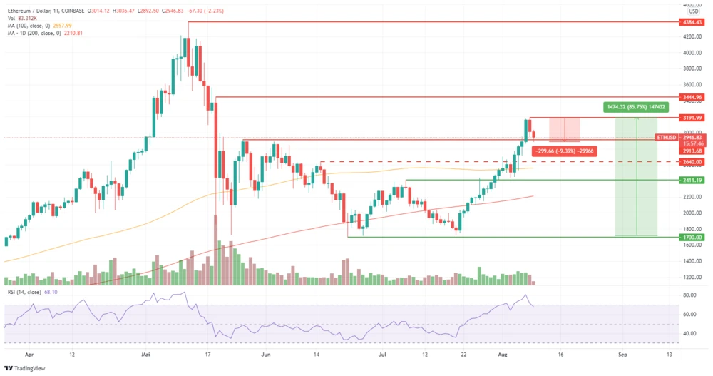 Die Bullen haben das Ruder bei ETH fest in der Hand. Der Preis für einen ETH-Coin legte seit dem 21. Juli zeitweise um 85 Prozent zu. Der Kurs pausierte die Rallye lediglich im Bereich der 2.600-Dollar-Marke für drei Handelstage. Im Anschluss pulverisierte ETH gleich zwei wichtige Widerstände bei 2.640 und bei 2.913 Dollar.